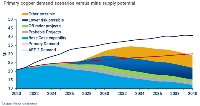 The price of copper has surged over the past year, raising questions about whether we are now entering a period of a tight market that could last for several years. The answer, according to Julian Kettle, Wood Mackenzie’s vice-chair of metals and mining, depends in large part on the pace of the energy transition. Our base case view of future copper demand, representing our assessment of the most likely outcome, is shown here by the red line. If that projection is correct, then demand can be met by the tiers of supply shown by the solid wedges until the mid-2020s. Beyond that, lower-risk possible projects would meet requirements until the mid-2030s. In a world where governments set policy to limit global warming to 2 °C, however, copper demand would grow much more rapidly, as shown by the dark grey line. In that market, Kettle says, “Even allowing for all probable projects to be developed (albeit with delays), supply would be unable to meet requirements, thereby becoming a constraint on an accelerated energy transition.” His conclusion: “Without decisive action, the lack of supply development really could come back to bite the copper industry.”