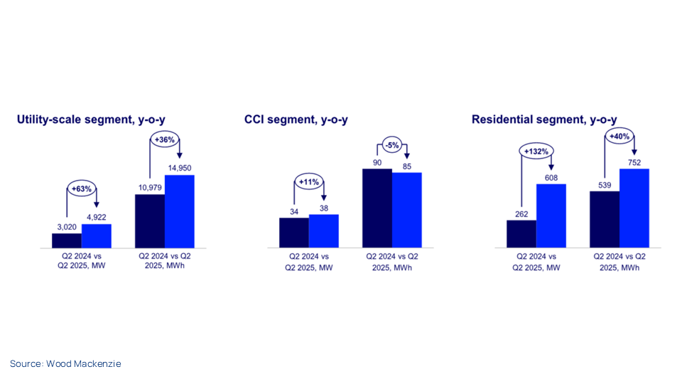 This comes from Wood Mackenzie’s most recent US Energy Storage Monitor report, produced in association with the American Clean Power Association. It shows installations in the second quarters of 2024 and 2025 in the three main sectors: utility-scale, residential, and commmunity, commercial and industrial (CCI). Q2 of 2025 was overall a strong quarter, but Wood Mackenzie analysts have raised concerns about the outlook. US utility-scale storage installations could drop 10% in 2027, largely because of uncertainty over the new Foreign Entity of Concern (FEOC) regulations on battery cell sourcing, our analysts say. See the full report for more details.