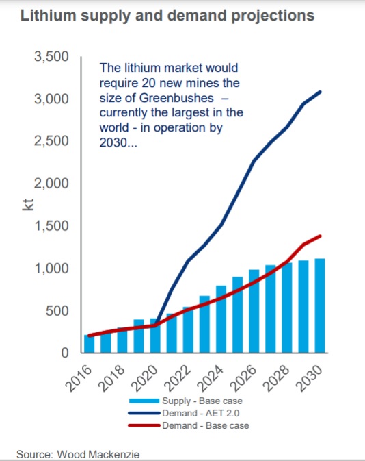 This comes from the new briefing on metals demand in the energy transition by Gavin Montgomery, Wood Mackenzie’s research director for battery raw materials. It shows the demand outlook for lithium over the coming decade in two possible future scenarios. The red line shows forecast demand in our base case, representing our view of what is most likely to happen. The blue line shows the implications for lithium demand in a scenario aligned with the Paris climate agreement, consistent with limiting global warming to 2 °C. In the Paris-aligned scenario, the uptake of electric vehicles is much faster and growth in demand for lithium is much steeper than in our base case. Ramping up production fast enough to meet that demand creates a challenge for the mining industry that seems “insurmountable,” Montgomery says.