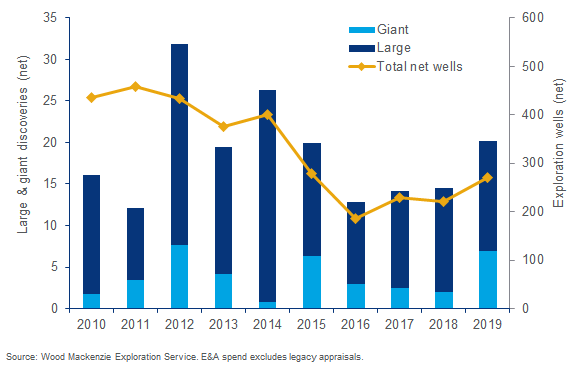 - More high-impact discoveries. Fewer wells, but these delivered a higher proportion of big finds. The 39 companies drilled over 400 wells a year (net) on average during 2010-14 making, on average, 21 ‘large and giant’ discoveries a year (100-500 mmboe and > 500 mmboe, respectively). The well count halved to 200 a year for 2015-19, yet the number of ‘large and giant’ discoveries still averaged 16. In fact, 2019 was the best wells-to-big-discoveries ratio of the decade.
