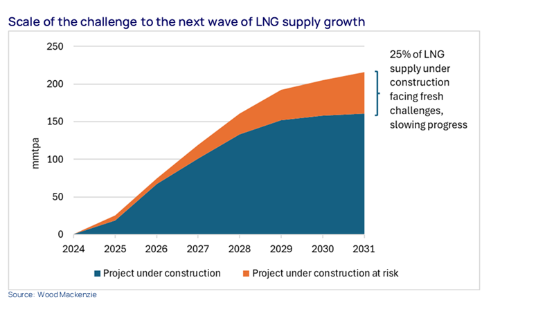 First, the timing and scale of the next wave of LNG supply the market will need to meet demand in the early 2030s is in some jeopardy, with up to 60 Mtpa of facing fresh challenges.