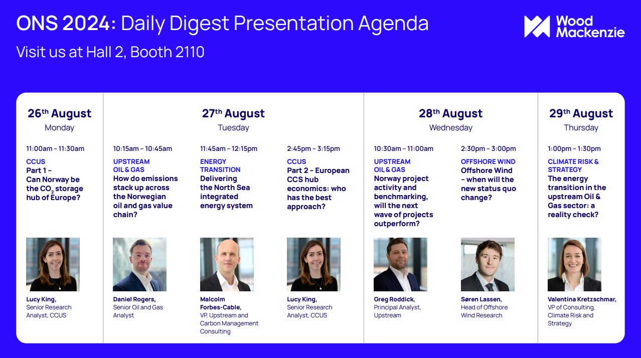 Wood Mackenzie is excited to attend ONS 2024 from the 26th - 29th August. Stop by our stand - hall 2, booth 2110 - where you can connect with our team of experts, demo our Lens products, and listen to our latest industry views with our 'Daily Digest' presentations at the stand.