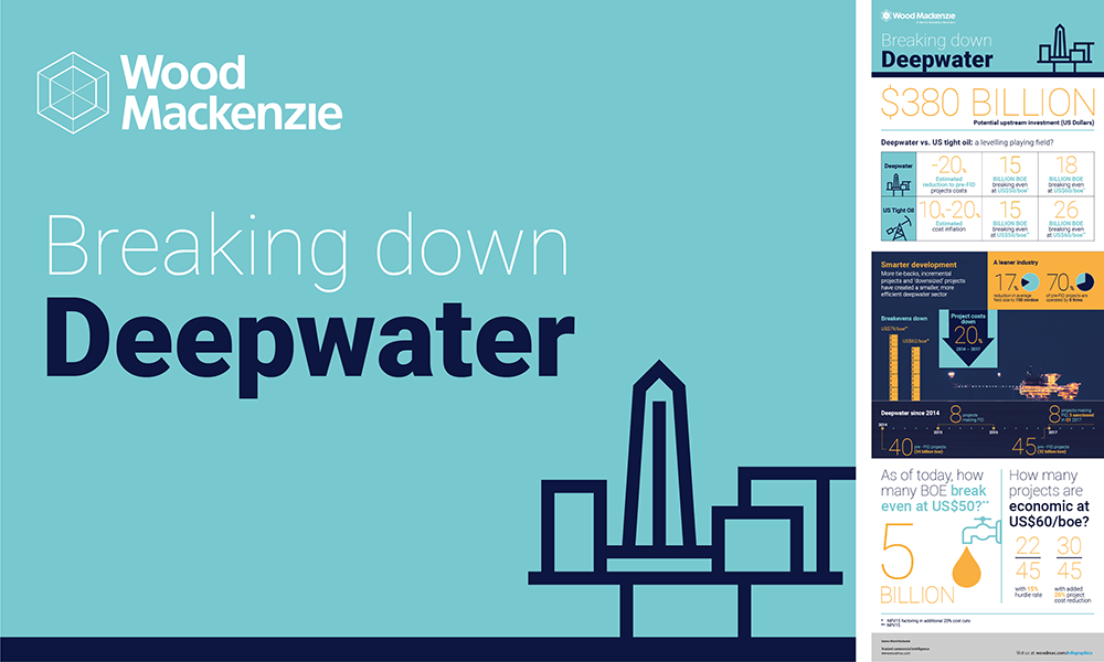 Drivers include re-worked project designs, fewer and cheaper wells, smaller facilities, and portfolio high-grading. By focusing on smaller but smarter developments, deepwater project breakevens are over 20% lower than mid-2014, with 5 billion barrels of oil equivalent (boe) breaking even at US$50/boe and 15 billion at US$60/boe (NPV15).