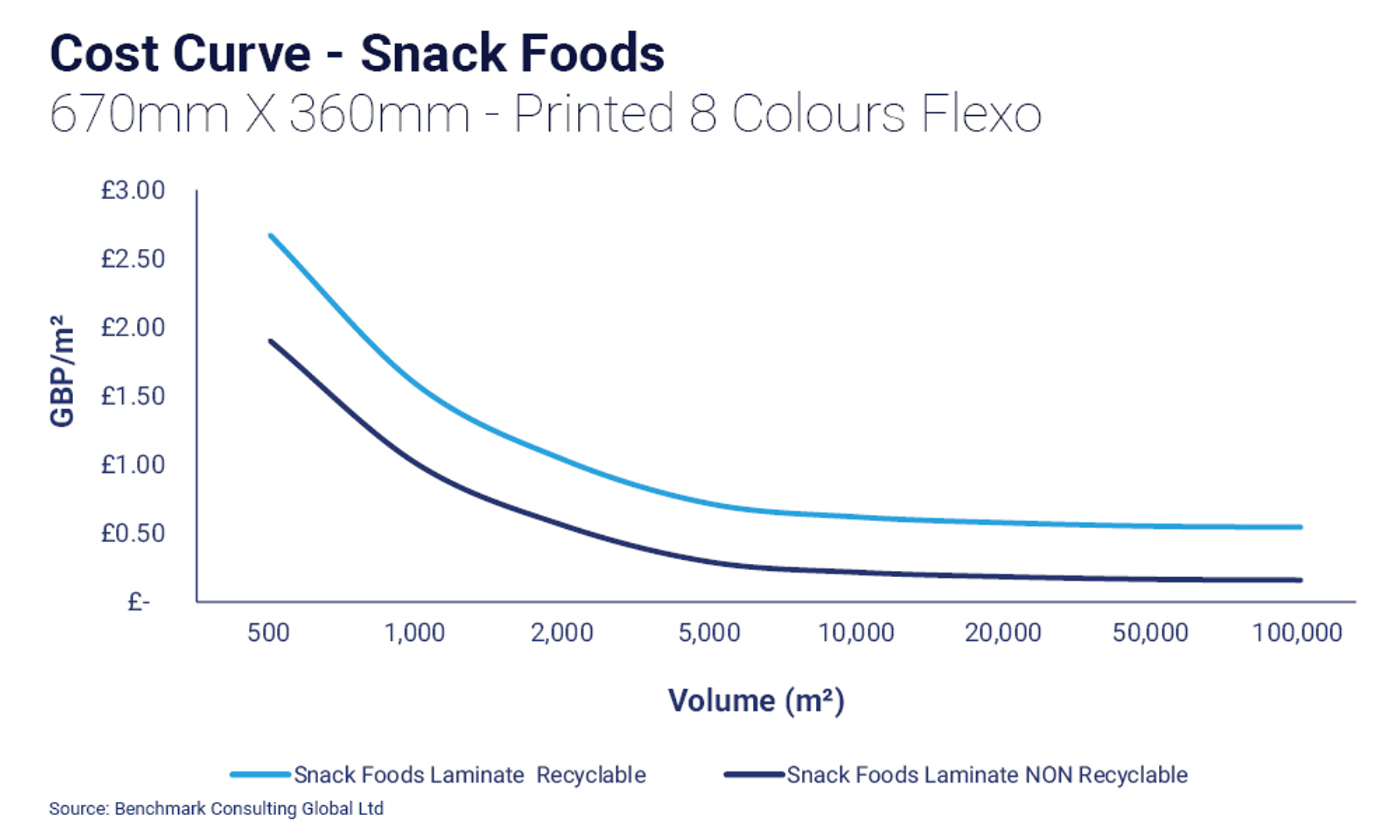 This fragmented approach is making it difficult to achieve the critical volumes required to make environmental solutions commercially viable. Film manufacturing, for example, has a global market and requires at least regional volumes, ideally global volumes, to remain cost competitive. Below we analyse the cost impact of substituting environmentally friendly alternatives in two very common materials used in packaging.
