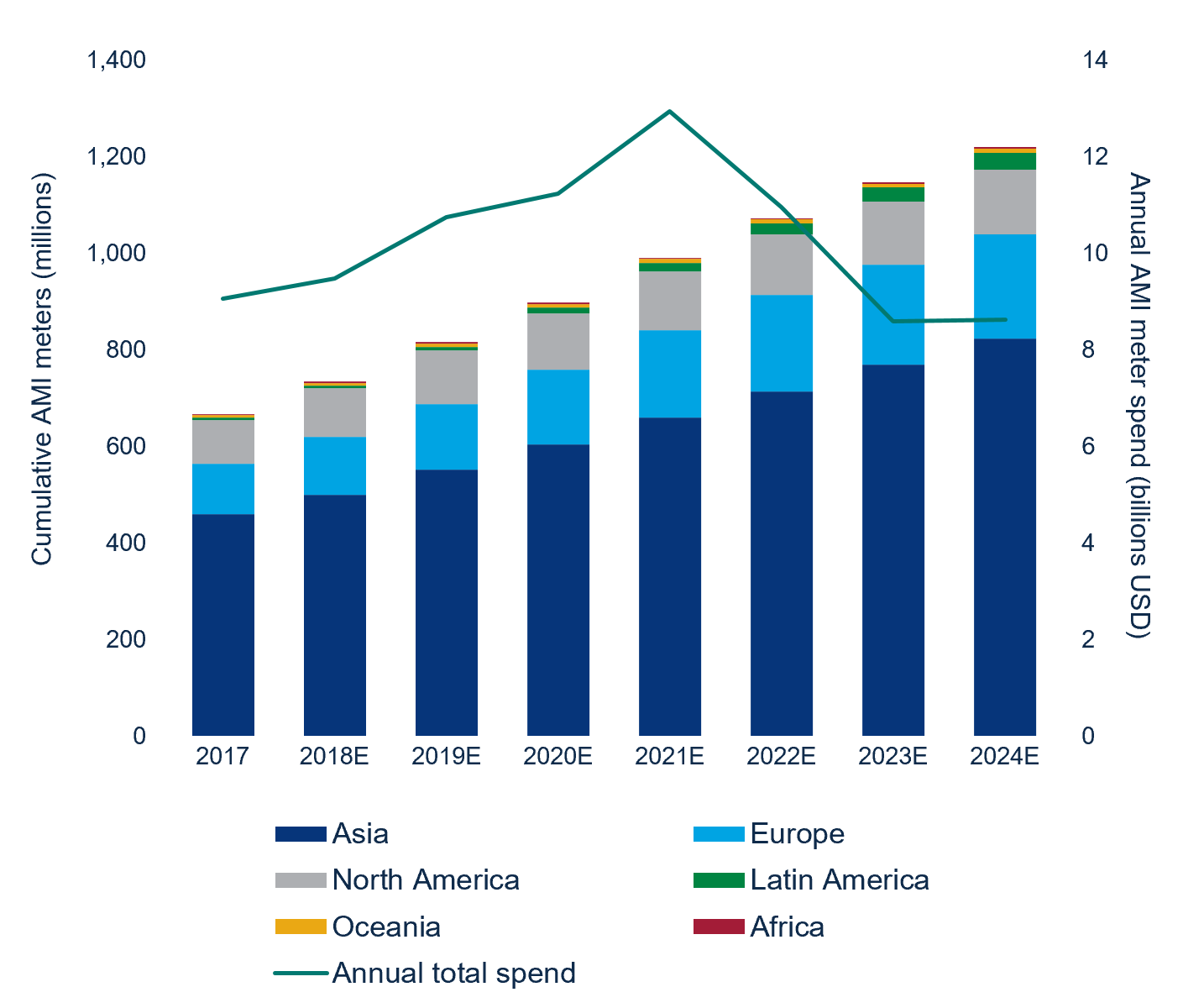 The global smart meter total will rise from 665.1 million in 2017 to more than 1.2 billion by the end of 2024, according to a our H1 2019 report on the market. Accordingly, the cumulative global expenditure on advanced metering infrastructure (AMI) will almost double over the same period, rising from $73 billion in 2017 to $145.8 billion in 2024 (all values USD).