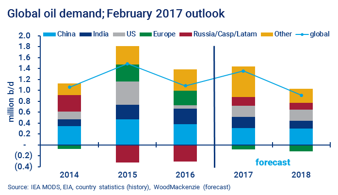 Current economic growth drivers are fading. Crucial elections in France, Germany and the Netherlands are a real concern which, coupled with further Greek debt negotiations, have contributed to our view that European oil demand will decline throughout 2017 and 2018.