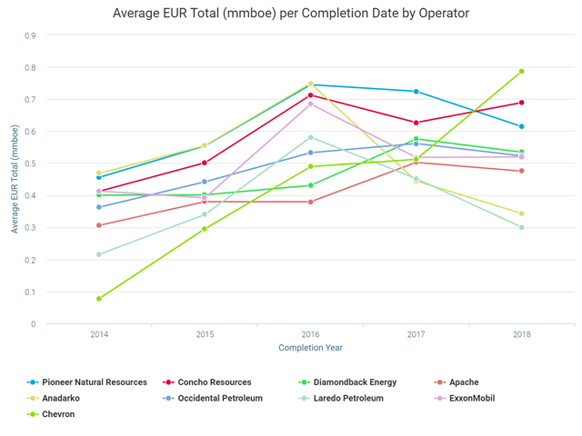 Exxon's IP isn't too impressive in Wolfcamp, but they tend to emphasize estimated ultimate recovery (EUR). Here's what Well Evaluator shows for EUR amongst the heavy-hitting producers: