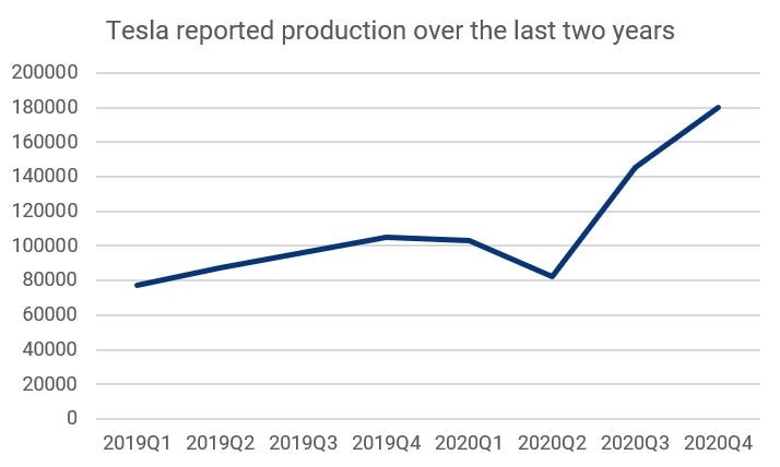 On 2 January 2021, Tesla reported Q4 2020 production of 179,757 vehicles, slightly missing the annual delivery guidance by 450 units. Prior to the quarter end, our Tesla Insight Report estimated a lower case production of ~180,000 for the fourth quarter, with base case setting up at 183,000 vehicles. In our base case construction, we estimated Shanghai production at 67,700 units for Q4, vs actual reported of 64,551 units – making up the entire difference and giving us confidence on our Fremont observations.