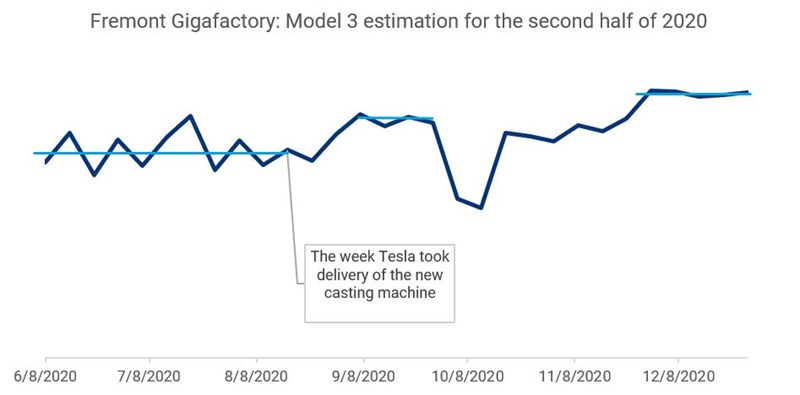 One of Tesla’s largest improvements achieved in 2020 was when they installed the world’s largest casting machine at its Fremont factory. This giant casting machine brings the rear underbody components of Model 3 and Model Y down to two pieces, whereas previously it consisted of 70 discrete pieces of metal. The casting machine accelerated vehicle production rate and was expected to enhance durability for both Model 3 and Model Y. Our data shows approximately 9% increase in Model 3 production capacity after the casting machine is put in service.