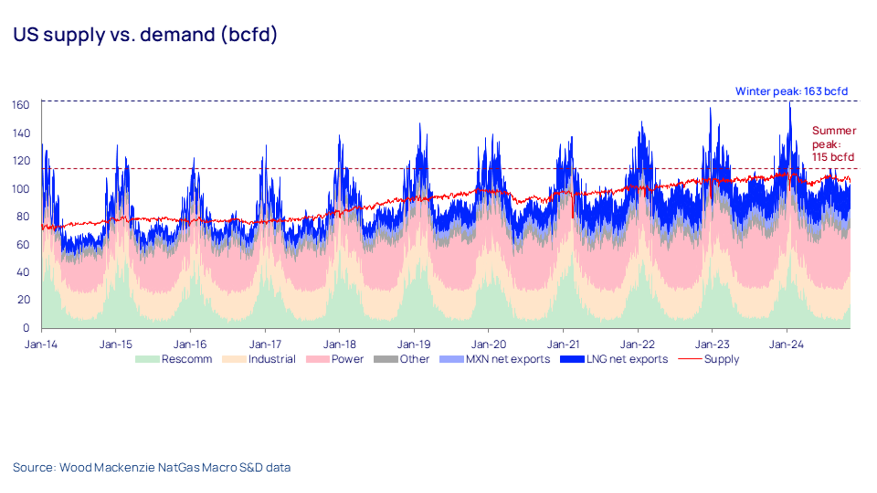 Another relatively new phenomenon in North America is the increasing volatility in demand for gas to produce electricity. Gas demand for power generation hit 58 billion cubic feet per day (bcfd) over the summer as cooling loads peaked – well over half of total US natural gas production of just over 100 bcfd. However, it’s not just summer demand that’s increasing – last winter saw demand peak at a record 44 bcfd.