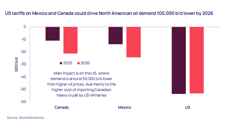 As well as lowering GDP growth for Canada and Mexico, planned tariffs would cause modestly higher refined product prices in the US, the combination of which would reduce overall North American oil demand by around 100,000 barrels per day (b/d). The main impact would be on the US, with demand around 50,000 b/d lower than our base case outlook.