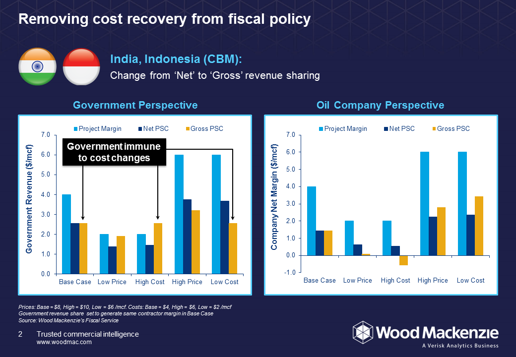 India recently introduced a new fiscal policy for the future award of marginal field licences. For many years, India has employed a traditional PSC, with production first allocated to cost recovery then remaining production ('profit oil') is shared between the company and government. Under its new revenue sharing mechanism (RSM), companies will bid for a simple share of revenue. How much profit companies can generate from that revenue while fulfilling their contractual work commitments is up to them. This model is also an option in Indonesia for coal bed methane investments.