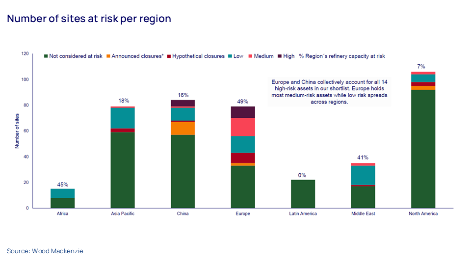 Our net cash margin (NCM) forecasts show that 101 out of 420 global refineries are at risk of closure. These sites represent around 18.4 million barrels per day (b/d) of capacity, which is 21% of current global capacity .