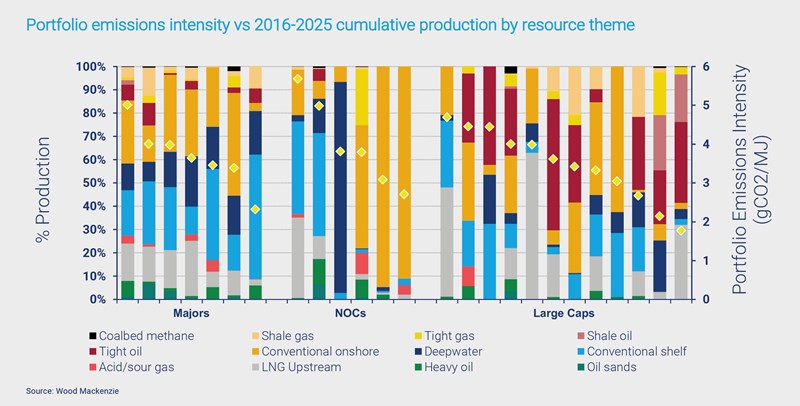 Since different resource themes such as LNG, heavy oil, or deepwater, demonstrate significantly different emissions intensities, a company’s balance of asset types can significantly affect its overall emissions intensity.