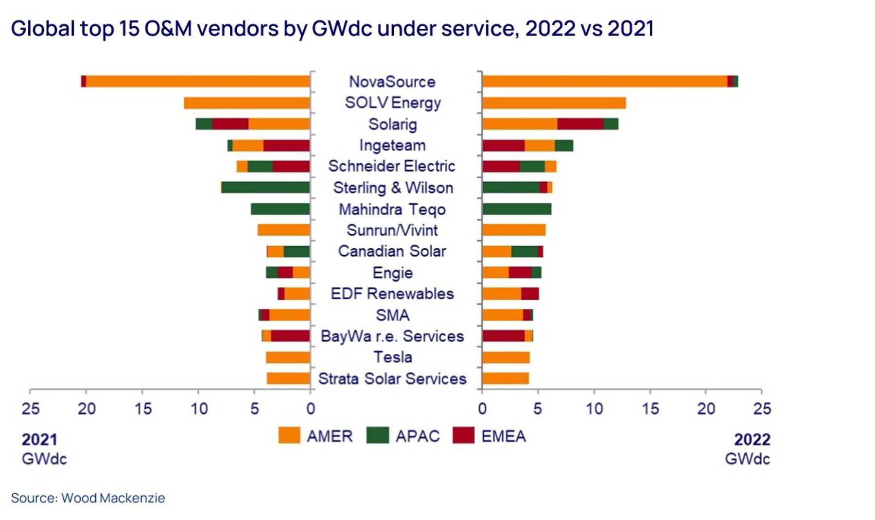 As mentioned, according to our 2023 Global PV O&M Service Provider Dynamics report, the world’s top 15 solar PV O&M providers expanded their combined portfolios by an annualised 13% for a total volume of 115 GWdc in 2022. Across the entire assessed portfolio, providers expanded their capacity under O&M contracts by 18%, for a total volume of 207 GWdc, slightly lagging the 26% year-on-year growth seen in global solar installations.