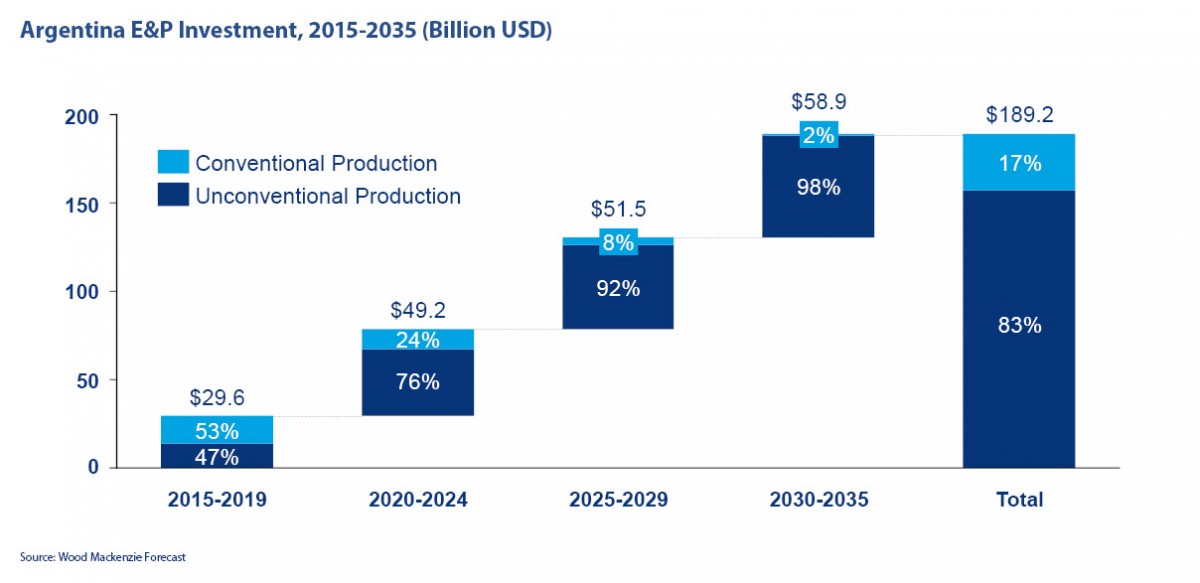 However, despite Argentina's world-class potential, there are a number of challenges. The national oil and gas company, YPF, which is responsible for most of the country's unconventional development activity today, cannot solely fund the capital required to develop Vaca Muerta shale and the Lajas and Mulichinco tight gas formations. Wood Mackenzie estimates that more than US$150 billion in capex will be required over the next two decades for unconventional development alone (83% of the total of Argentina's E&P capex). Experienced North American unconventional players might see funding a portion of this as a golden opportunity to further invest in the market as we see up to 85% of the capital coming from outside YPF.