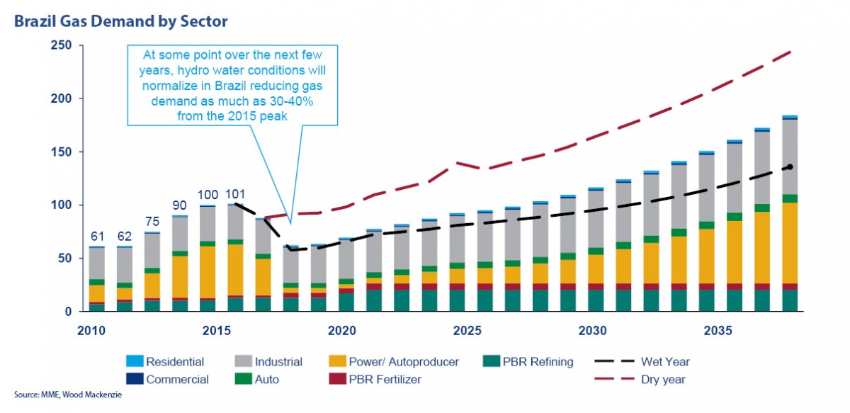The industry today finds itself in an uncomfortable position – gas demand has grown 10% per year since 2010, with the 2012-2015 drought driving that demand growth in the power sector. This has simply masked the impact of the struggling Brazilian economy, slowing policy development, and Petrobras' project delays on long-term gas demand.
