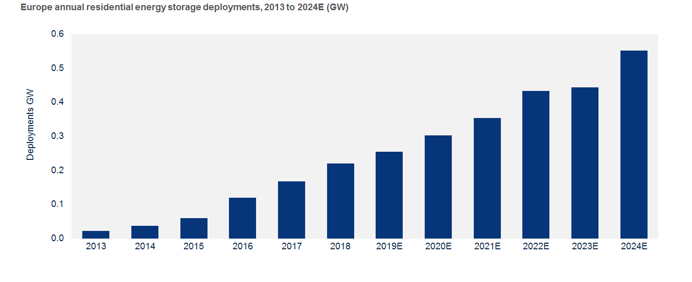 The European residential storage market deployment base is expected to grow five-fold to 6.6 GWh by 2024, according to new research from Wood Mackenzie.