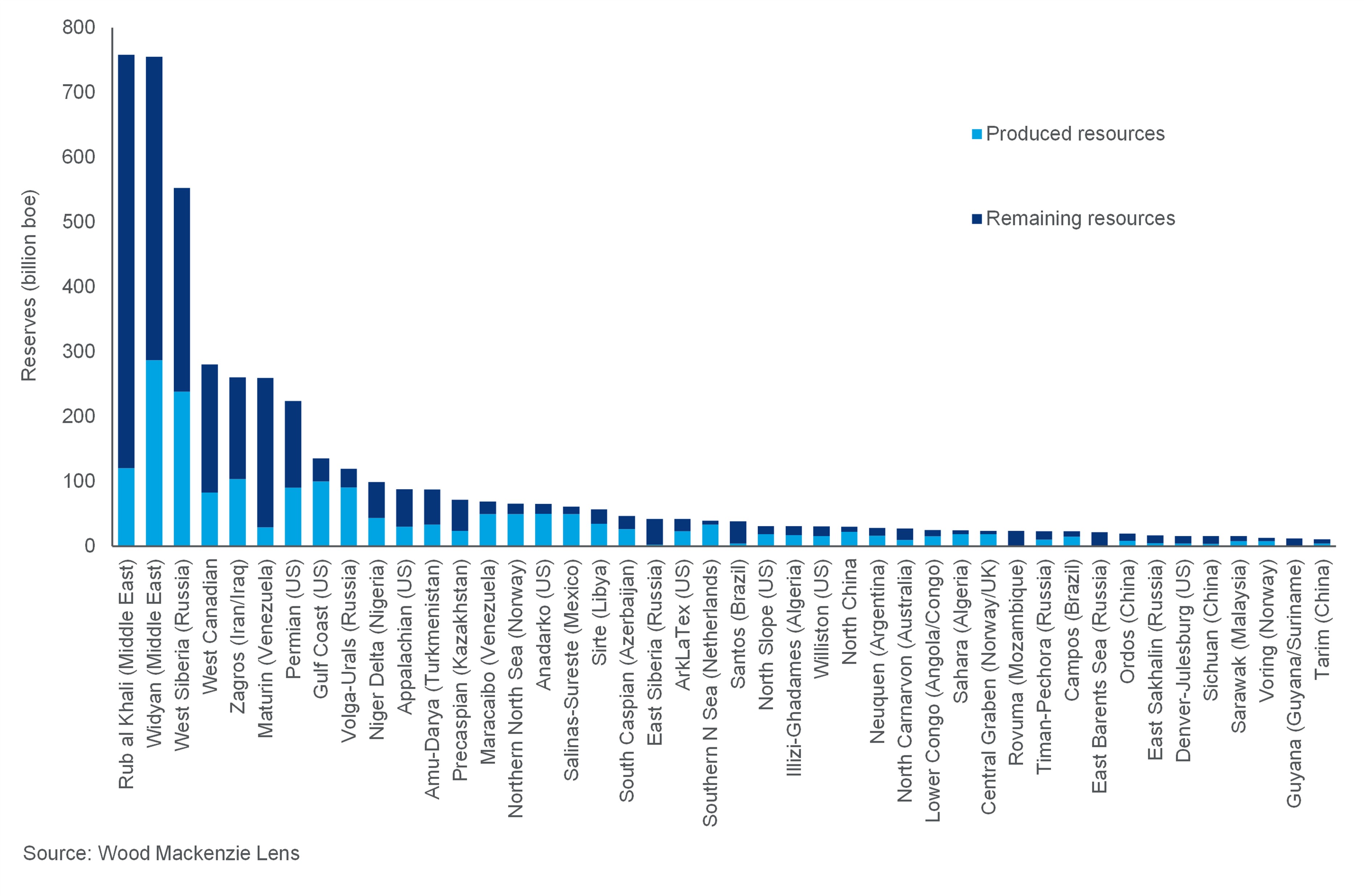 Fewer than 50 traditional super basins supply more than 90% of the world’s oil and gas. These are defined as basins originally holding more than 10 billion boe resources, of which more than 5 billion boe remains.