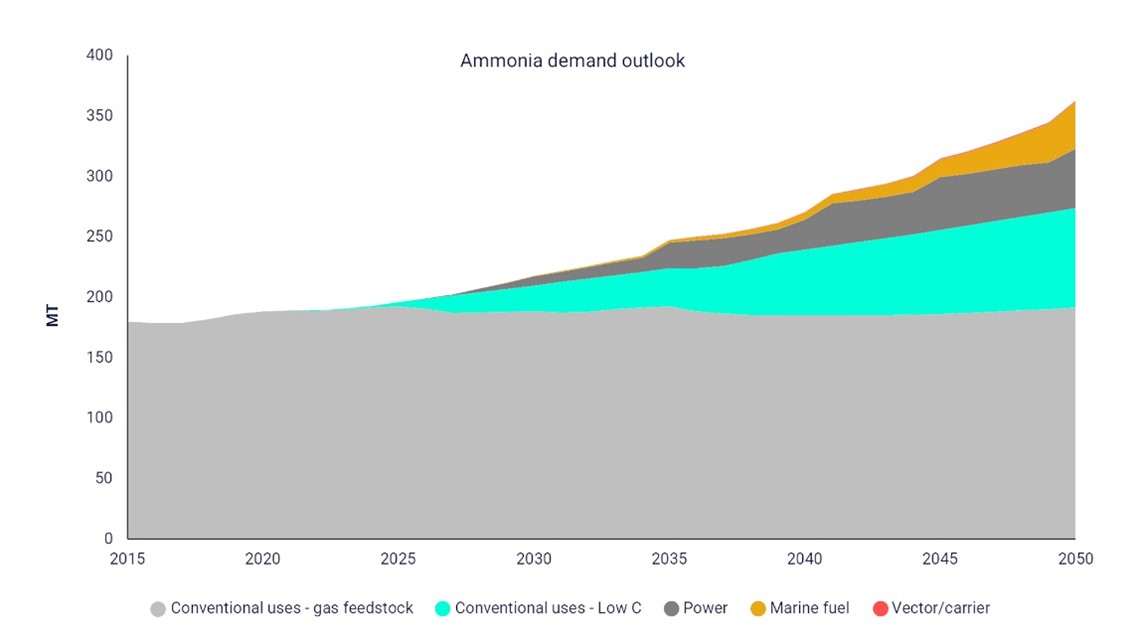 - Maritime – Current projections by Wood Mackenzie’s downstream research team indicate that ammonia could make up for around 40% of global e-fuels by 2050, accounting for 40 Mt of demand.