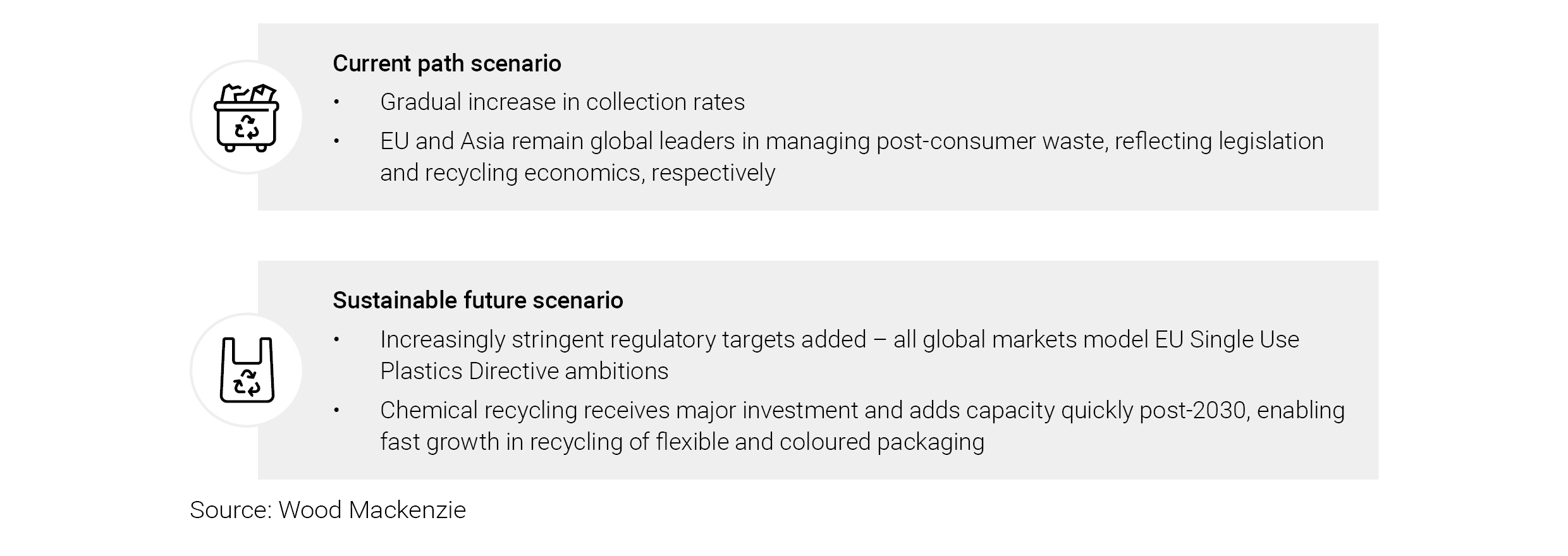 Wood Mackenzie ran two scenarios focused on the major packaging polymers - polyethylene (PE), polypropylene (PP) and polyethylene terephthalate (PET) - to answer this question. A ‘Current Path’ scenario represents the world if it continues as it is today, while a ‘Sustainable Future’ scenario sees more stringent legislation implemented to incentivise companies to be ambitious.
