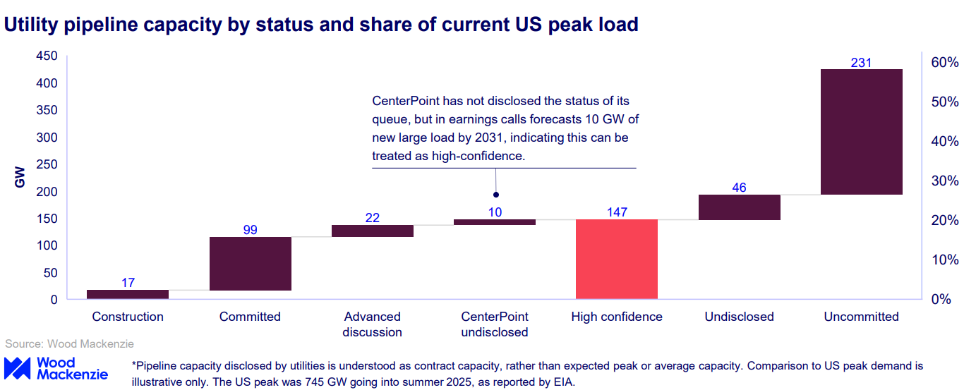 US utilities have committed to 116 GW of large load capacity growth, equal to 15.5% of current US peak demand