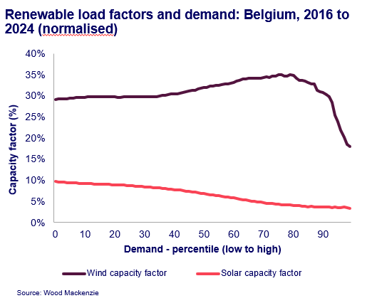 Caption: The highest 1% of demand days in Belgium experience an average wind capacity factor of only 15%.